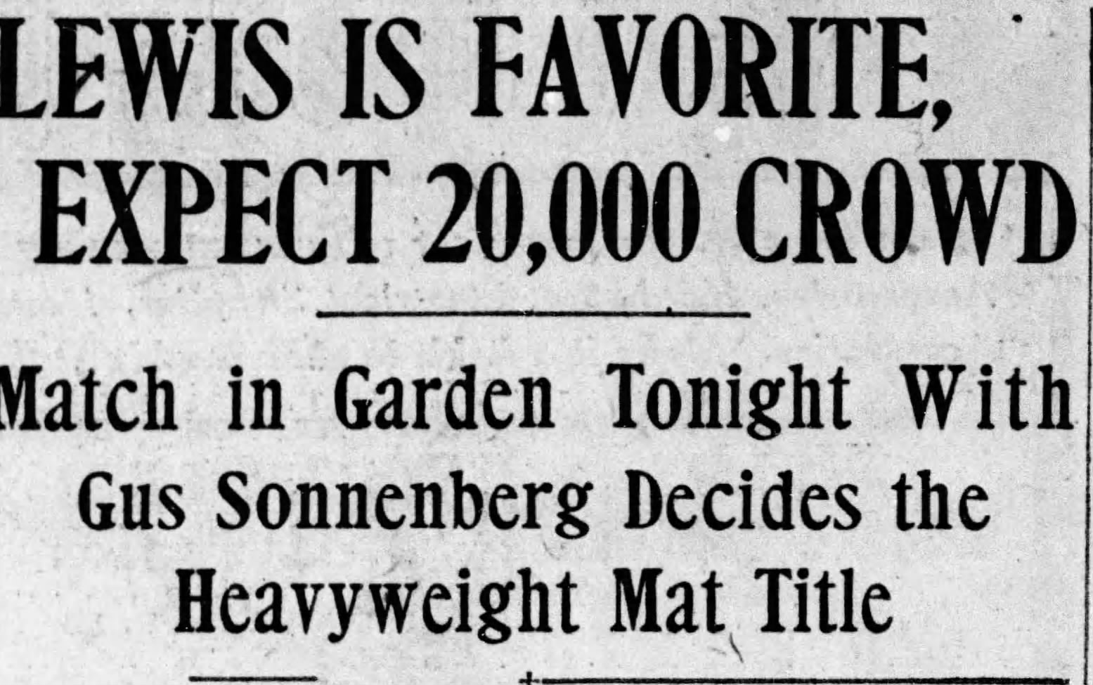 0.000 kişilik kapasitesi tamamen dolmuş ve ayakta izleyici alanları bile dolu olan kalabalık, 72.000 dolar gelir sağladı. Sonnenberg ilk fall’u 30 dakika 46 saniyede uçan tackle ile kazandı. İkinci fall’da ise peş peşe yaptığı tackle’larla Lewis’i ringin dışına attı ve Lewis 8 dakika 20 saniyede sayıyla yenildi. Yerel yıldızın, sektörün en büyük ismini yenerek dünya şampiyonu olmasıyla salon adeta coştu. Bu kapı geliri, bugünün parasıyla 1 milyon dolardan fazla ederdi ve o dönem için profesyonel güreş tarihindeki en büyük üçüncü gişe geliri oldu. Boston Herald maçtan önceki haberinde, Sonnenberg kazanırsa Frank Gotch’tan bu yana en popüler dünya şampiyonu olacağını yazmıştı. Maç o kadar büyük ilgi görmüştü ki, filme çekilip ABD’nin dört bir yanındaki sinemalarda ve Avrupa’da gecikmeli olarak gösterildi.